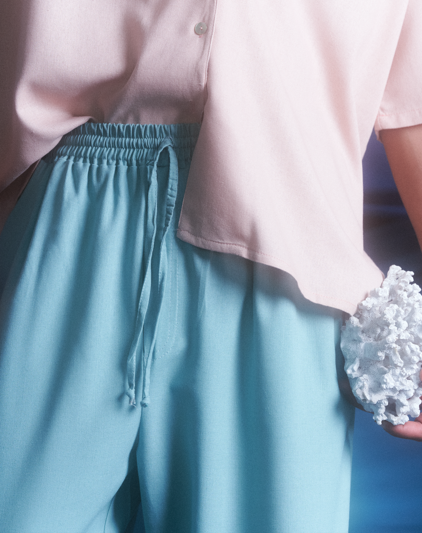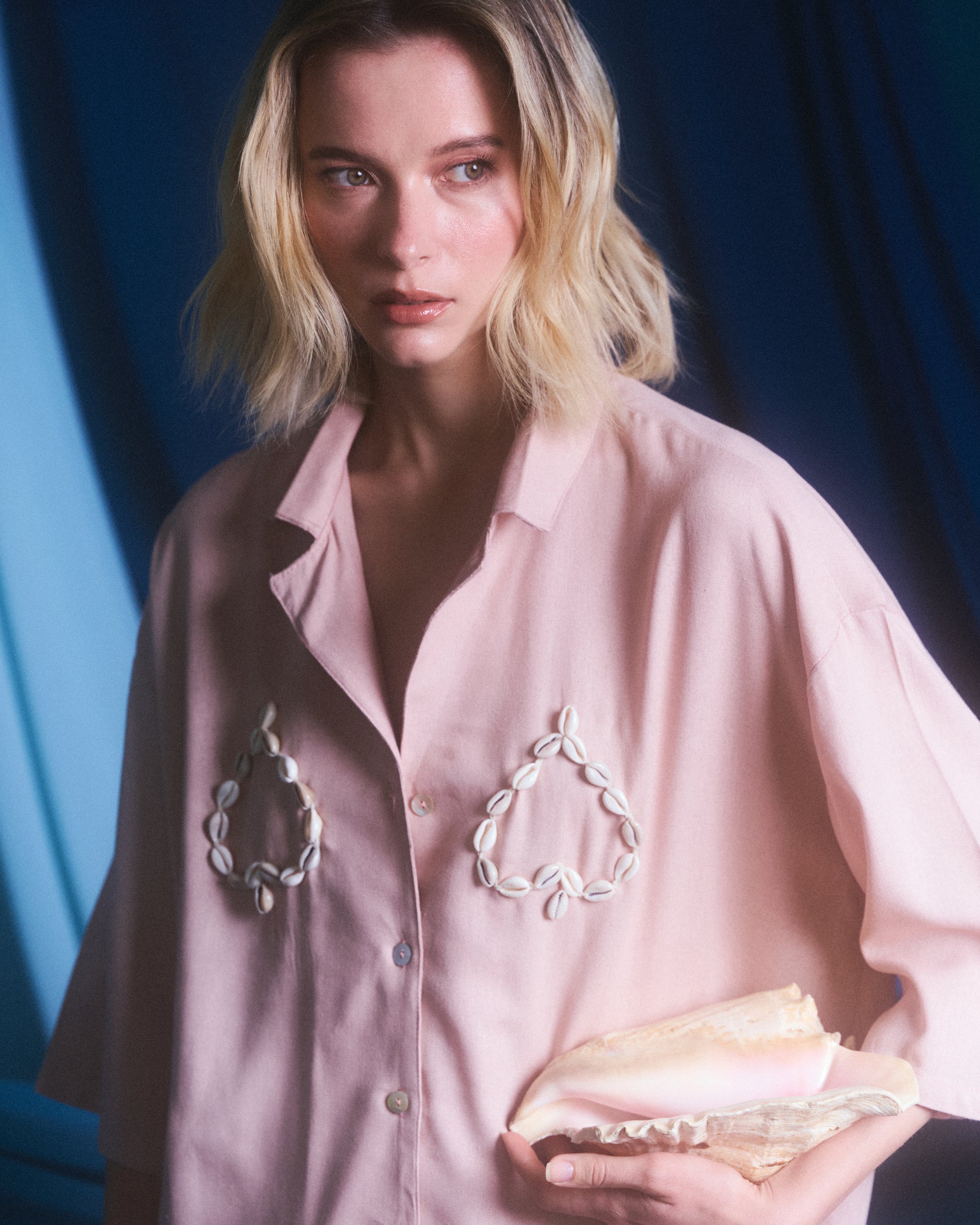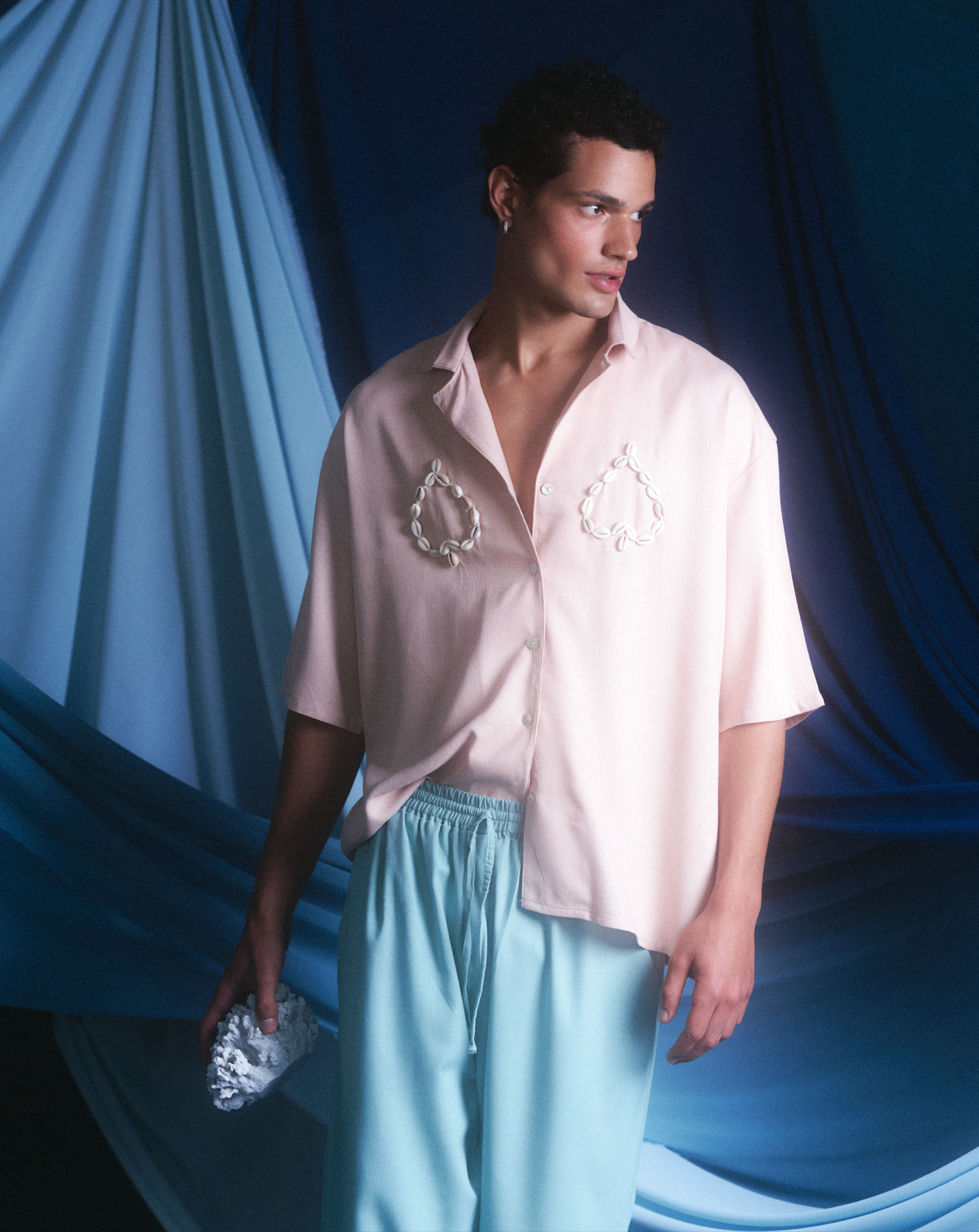 El detalle protagonista se encuentra en el pecho, donde aplicaciones de conchas naturales son bordadas a mano, una a una, por artesanos locales. Este trabajo minucioso transforma la pieza en una obra textil única, que celebra la imperfección y belleza del proceso manual.