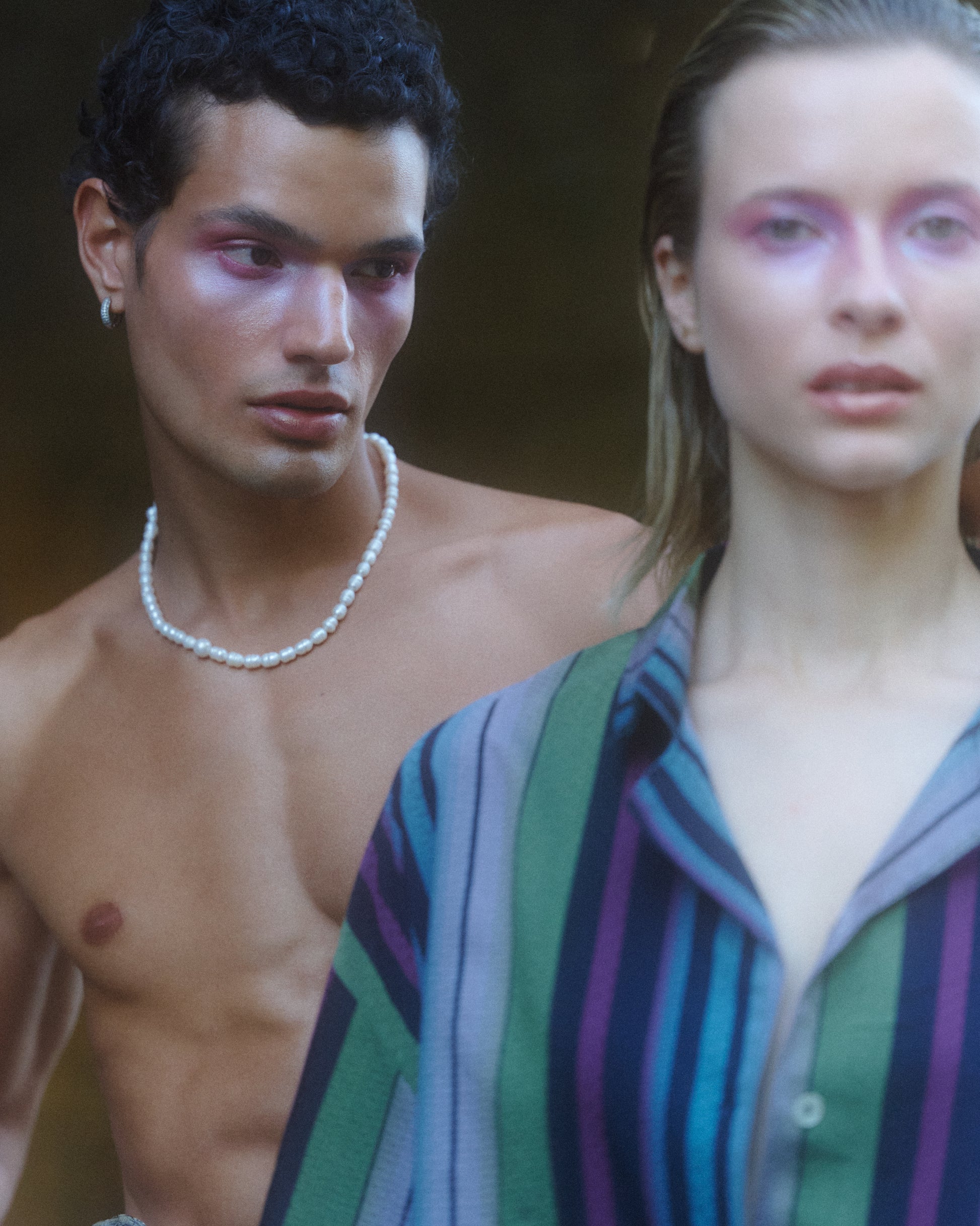 El textil, una seda natural de base negra y listones en degradé para una composición única y origina, coronada por botones perlados que otorgan luminosidad y carisma a la camisa.